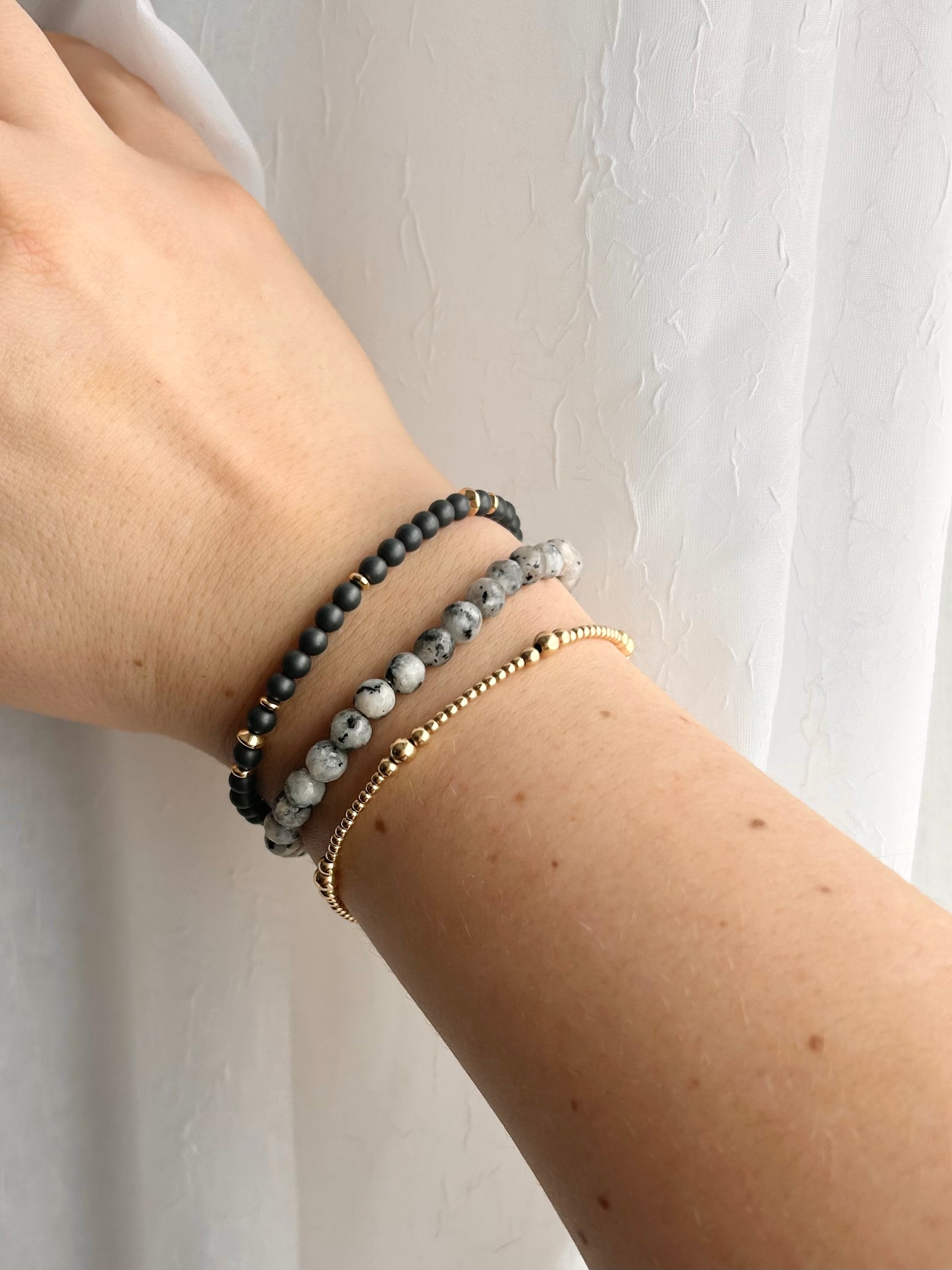 Obsessing over this neutral stack with its shades of deep charcoal, light and smokey grey and metallic hints! We love this Duo paired with the metallic southwest (pictured) and for a sentimental touch the black onyx Morse code bracelet!