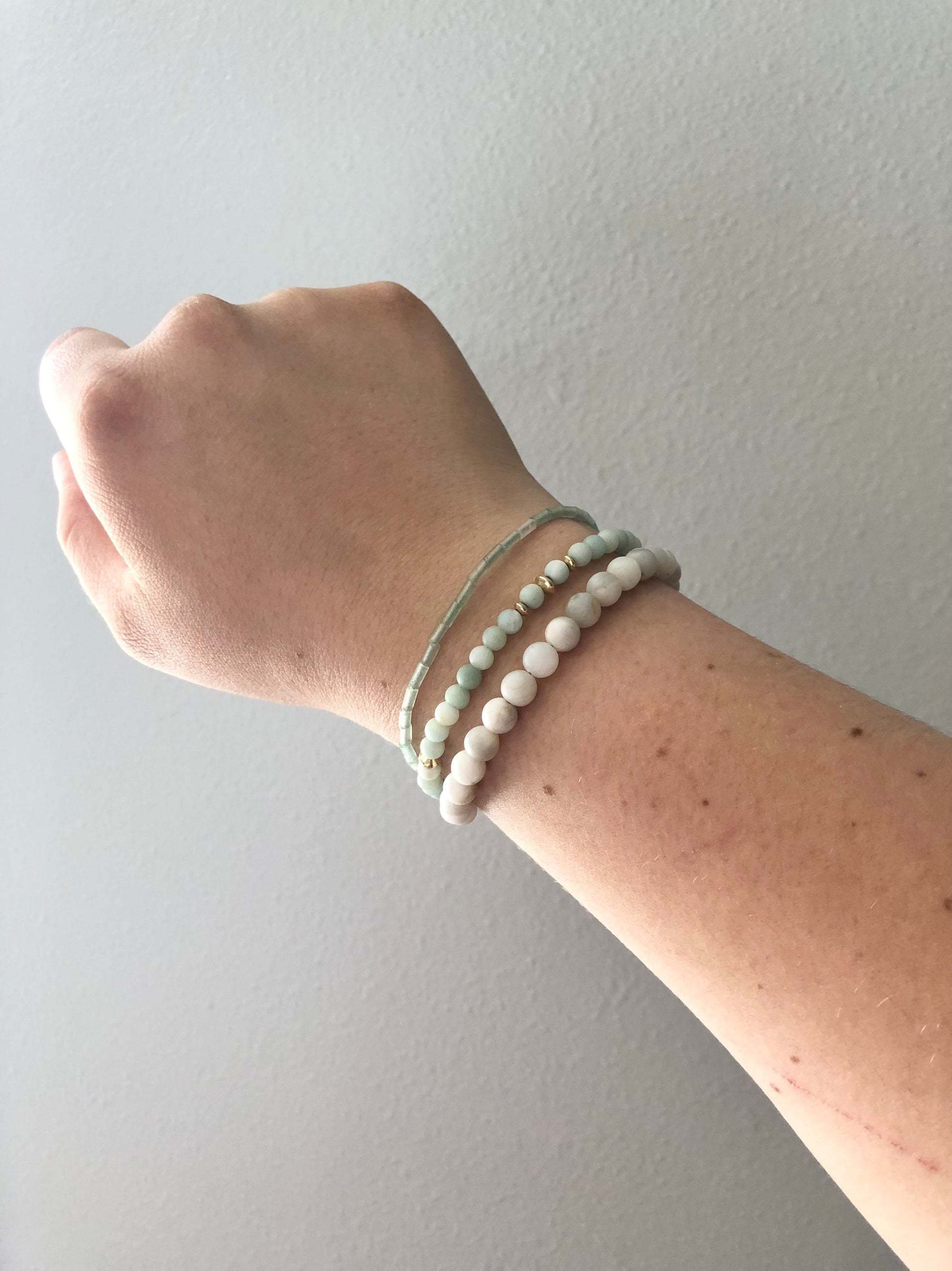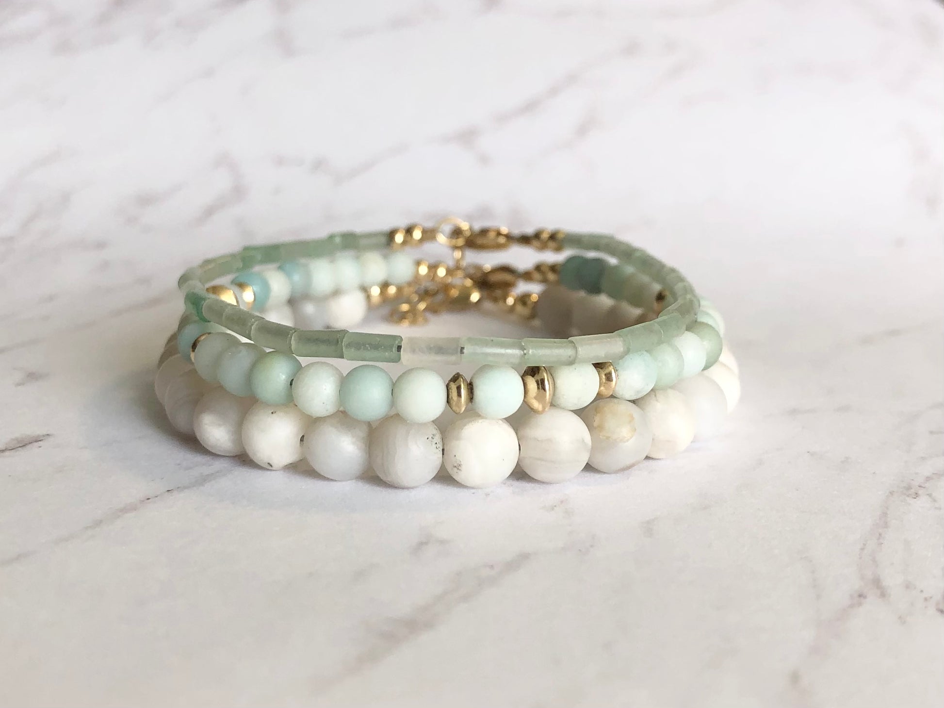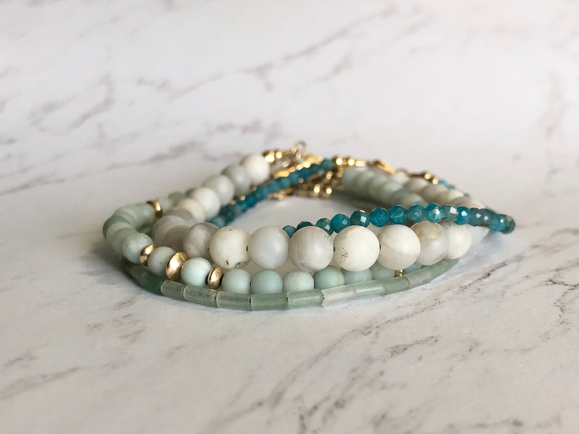 Does the cool tones of this Teal Blues Bracelet Stack remind anyone else of a day by the water? Hints of gold + shades of blue and green make the perfect pairing for your next everyday bracelet stack!
