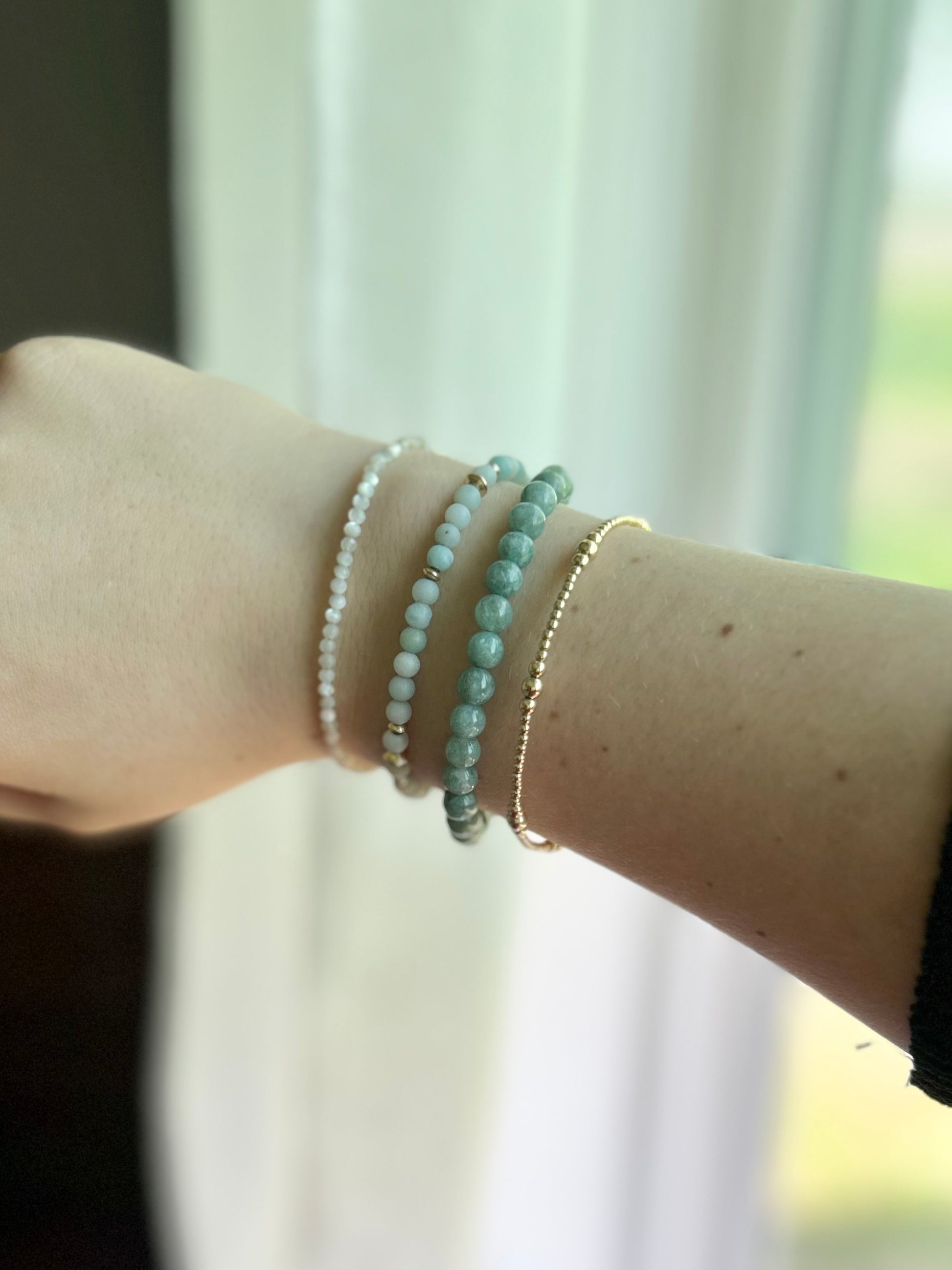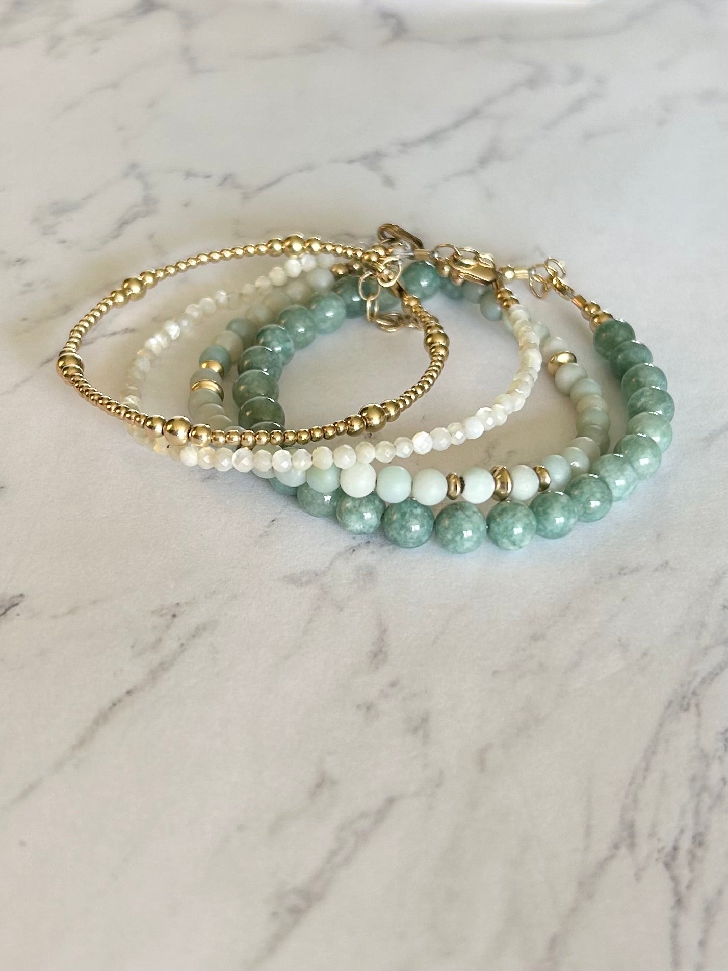 You can't go wrong with the cool + subtle colors in the "Sea Foam Stack". The varied colors, design and bead sizes + textures flows perfectly together in this gorgeous stack. Wear them as a set or mix and match them with other stacking bracelets in your collection!