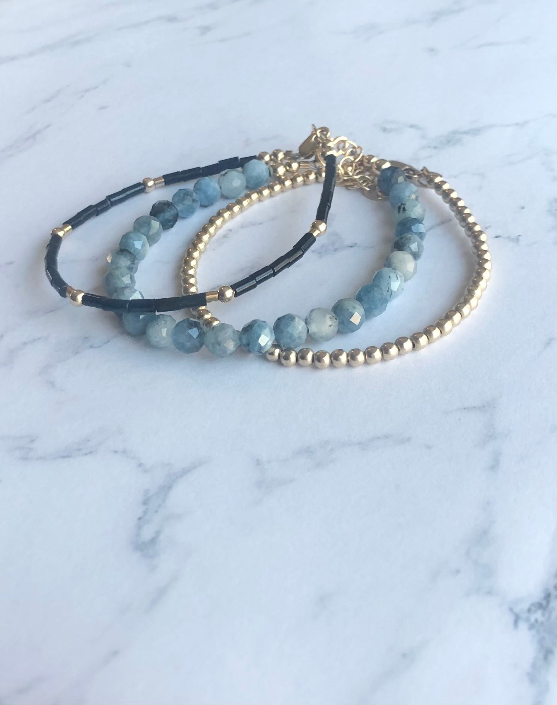 Attention Blues + Denim lovers this stack is for you! The gorgeous variations of this aquamarine bracelet is the perfect everyday accessory for those of you who wear demin in your regular rotation. Paired with the Onyx Dash Bracelet to balance + add a chic touch of gold, you're sure to complete any outfit you throw on accessorized with this pair!